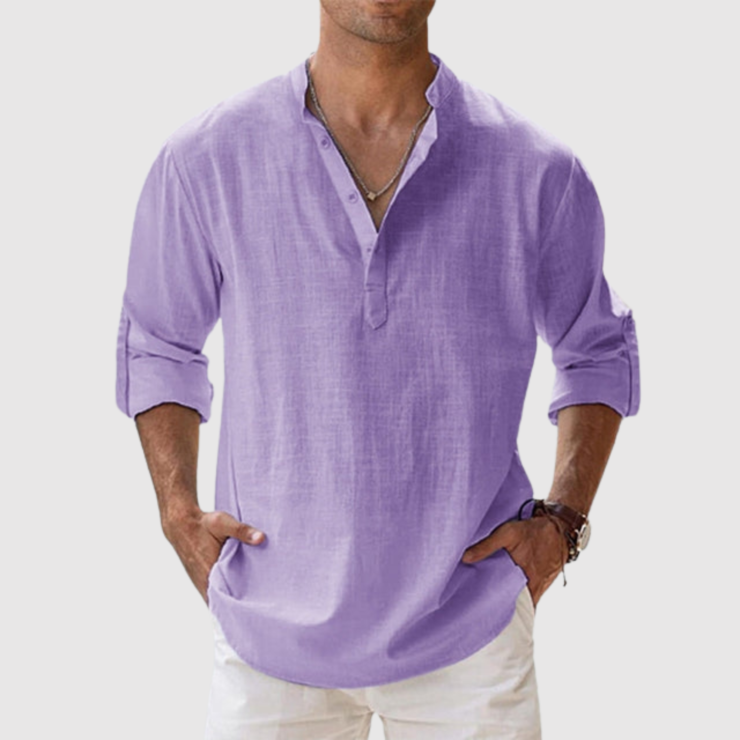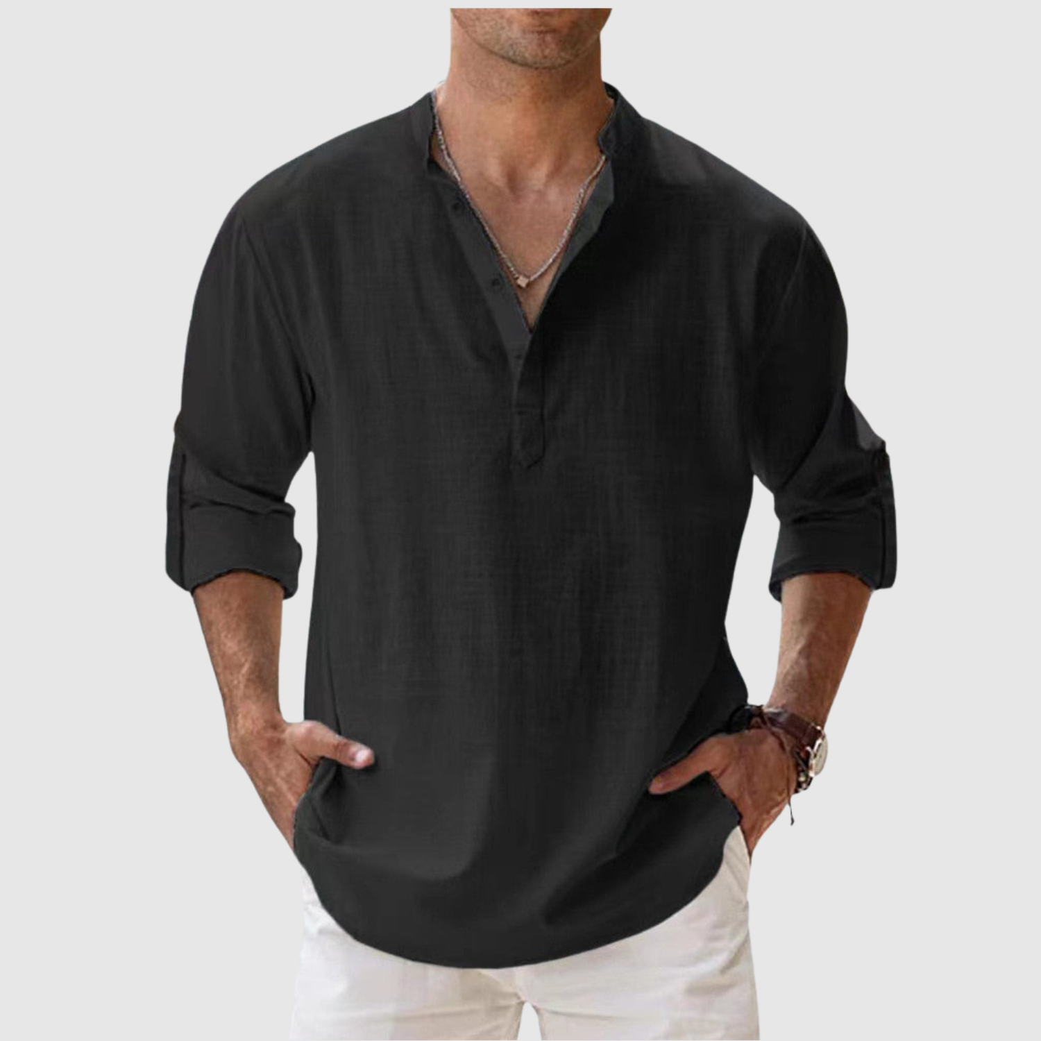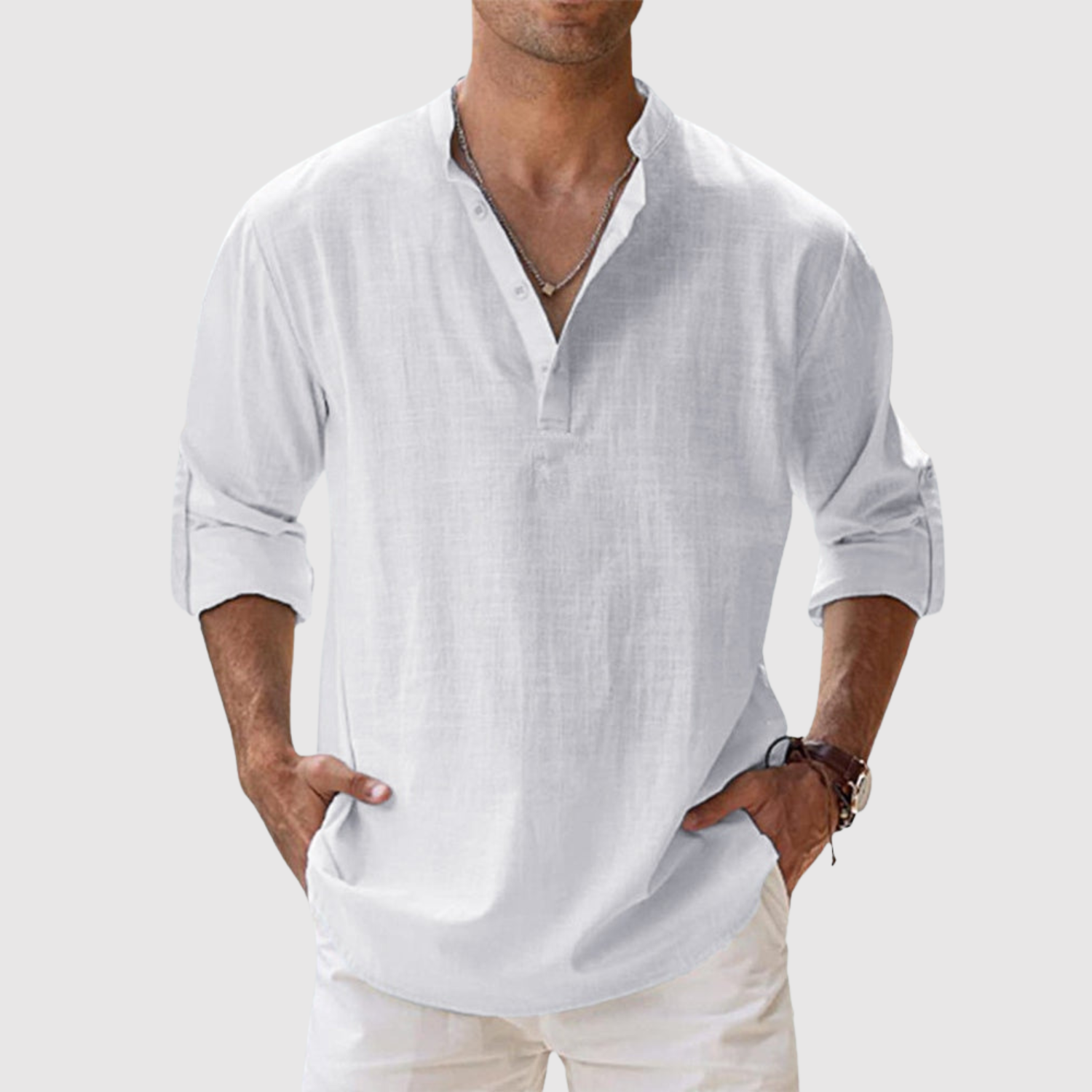 A vászon ingünk olyan férfiak számára készült, akik friss és modern megjelenést keresnek, anélkül, hogy lemondanának a kényelemről. A laza szabás és az univerzális dizájn révén ideális a tengerparti sétákhoz és a laza városi stílushoz egyaránt. A könnyű és lélegző anyag egész napos kényelmet biztosít, míg a nyitott galléros és felhajtható hosszú ujjú dizájn praktikus és időtlen elemmé teszi.