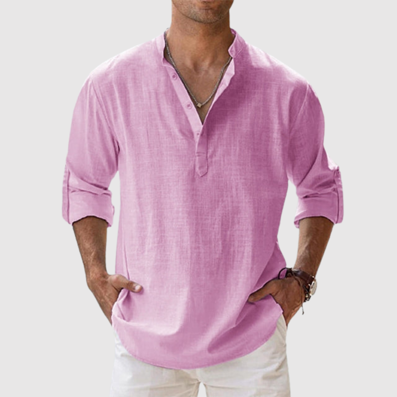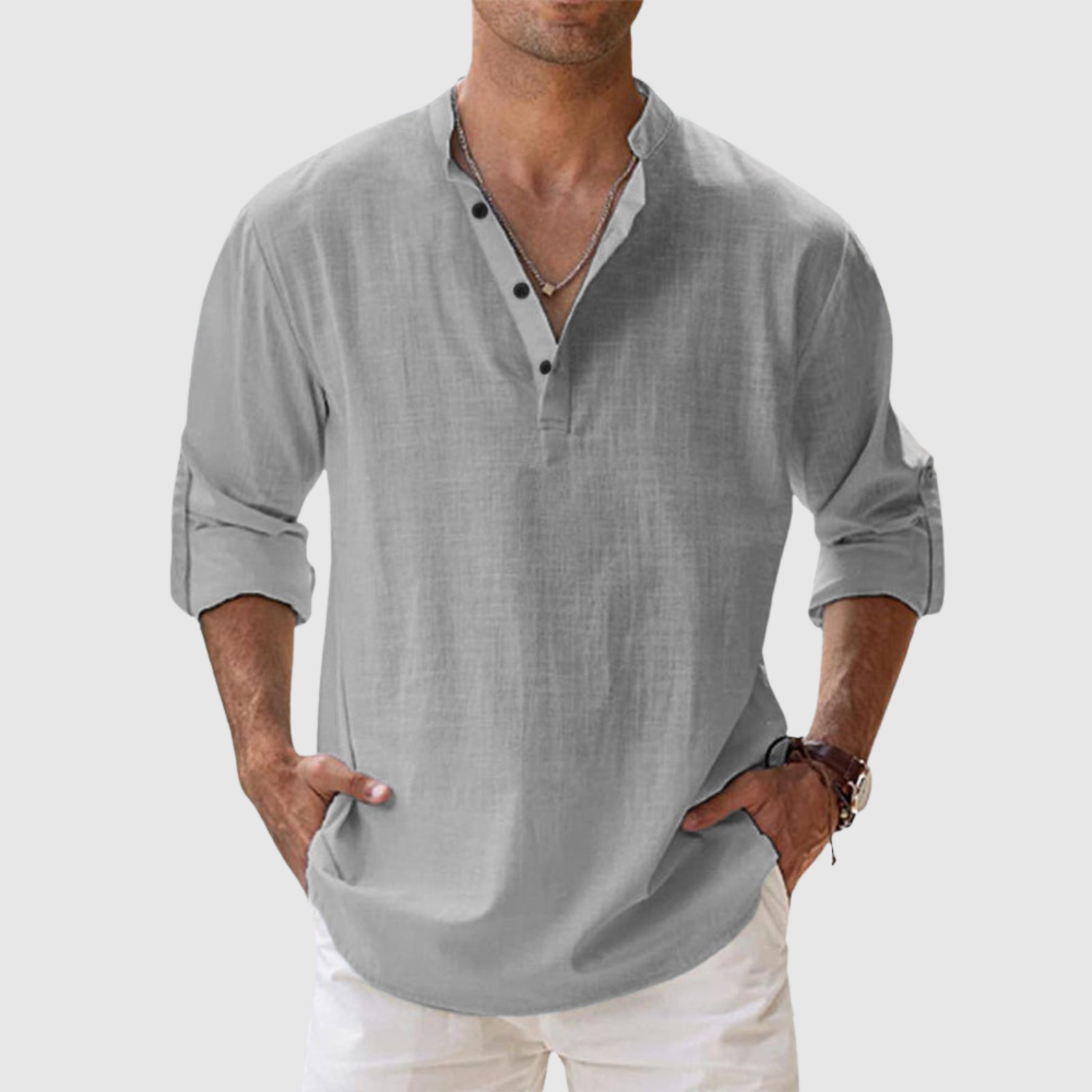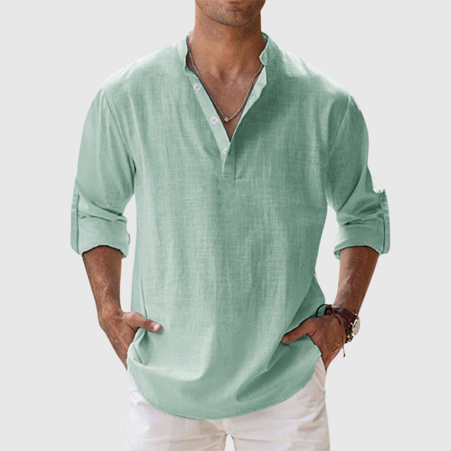 A vászon ingünk olyan férfiak számára készült, akik friss és modern megjelenést keresnek, anélkül, hogy lemondanának a kényelemről. A laza szabás és az univerzális dizájn révén ideális a tengerparti sétákhoz és a laza városi stílushoz egyaránt. A könnyű és lélegző anyag egész napos kényelmet biztosít, míg a nyitott galléros és felhajtható hosszú ujjú dizájn praktikus és időtlen elemmé teszi.